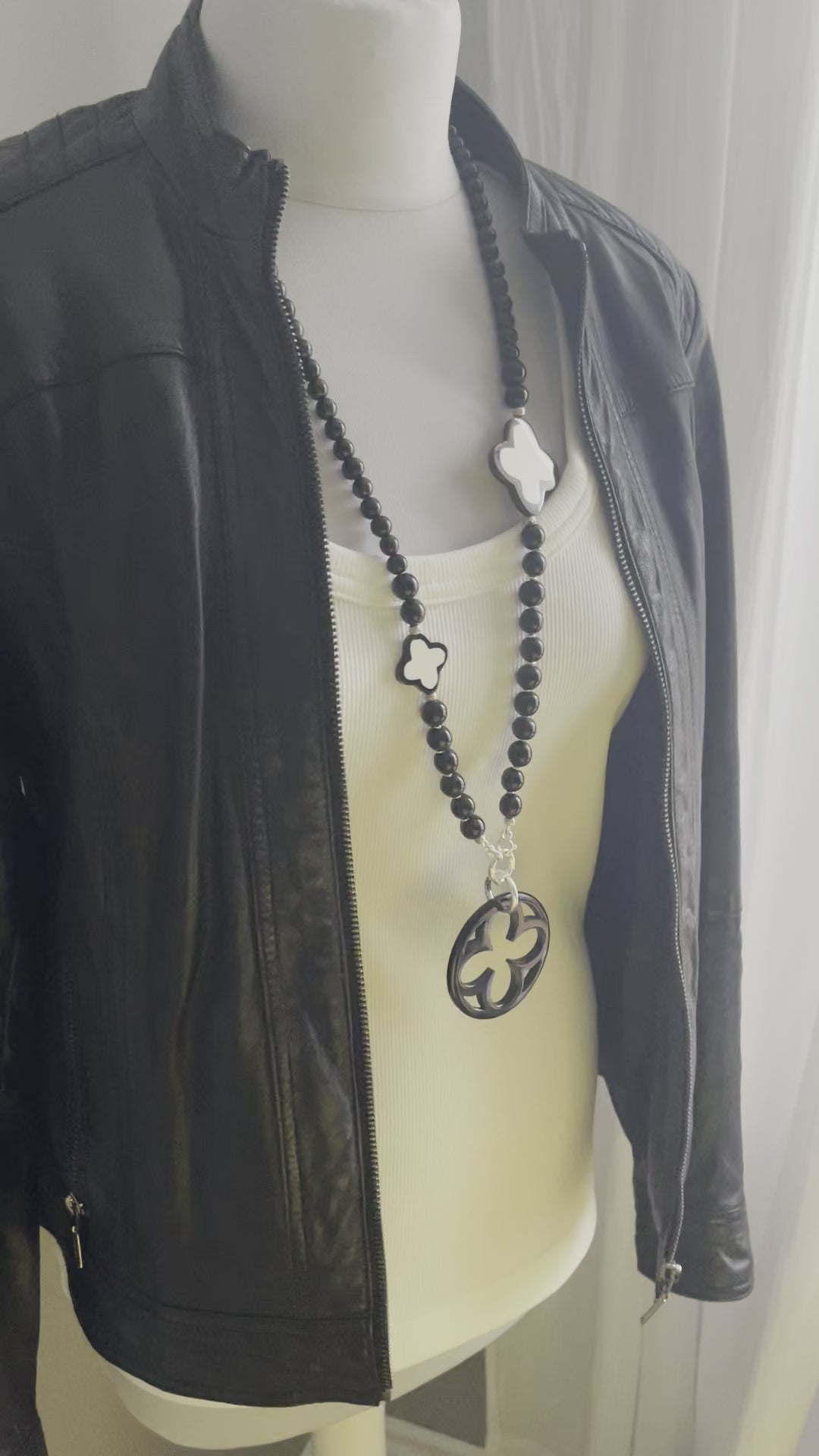 Verleihe Deinem Look mit der edlen Kette Horn "Black & White" ein zeitloses Gefühl von Eleganz. Handgefertigt aus natürlichem schwarzem Horn und edlen Ornamenten in schwarz-weiß, wird die leichte Kette warm und leicht an Deinem Hals liegen. Mit diesem Schmuckstück wird jedes Outfit zum perfekten Statement.