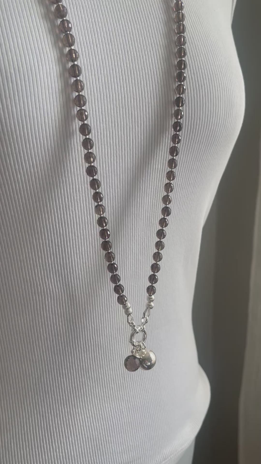 Anmutig sind Rauchquarzperlen eingefasst, die von filigranen Zwischenperlen aus feinstem Sterlingsilber begleitet werden.